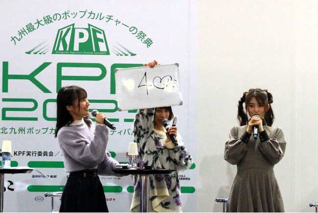 同じく11月26日(日)に実施したイベント「リンカイ!Realきゃんぷ in JAM広場」では、川村海乃さん、葵あずささん、佐々木李子さんの3人がイベントMCを務めた「じょーじとまるお」のじょーじさんと九州と競輪にまつわるクイズで対決しました。「競輪発祥の地は?※1」「九州ににある競輪場はいくつ?※2」といった5問の出題に対し、キャスト陣は5問中3問正解、じょーじさんは4問正解で九州出身の強さを見せ、キャスト陣としては悔しい結果となりました。