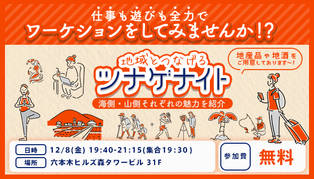 地方移住・多拠点居住支援イベント『ツナゲナイト』を開催!今回のテーマは「ワーケーション」~12/8(金)19時30分 @六本木~