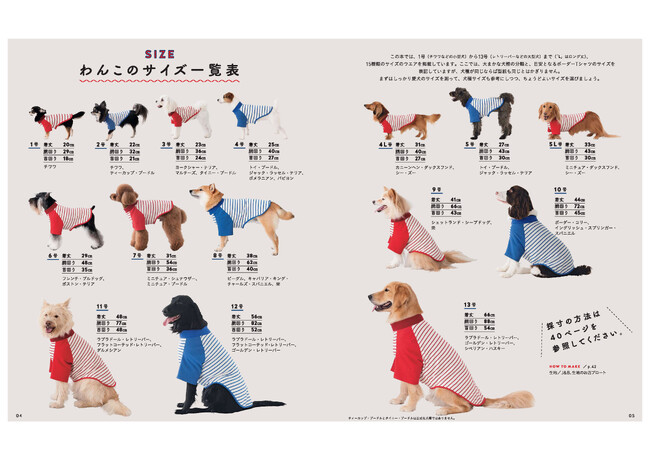 本書は、チワワなどが対象の1号から、ゴールデンレトリーバーなどが対象の13号までのウエアを紹介。