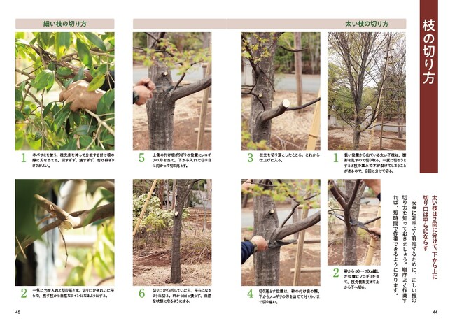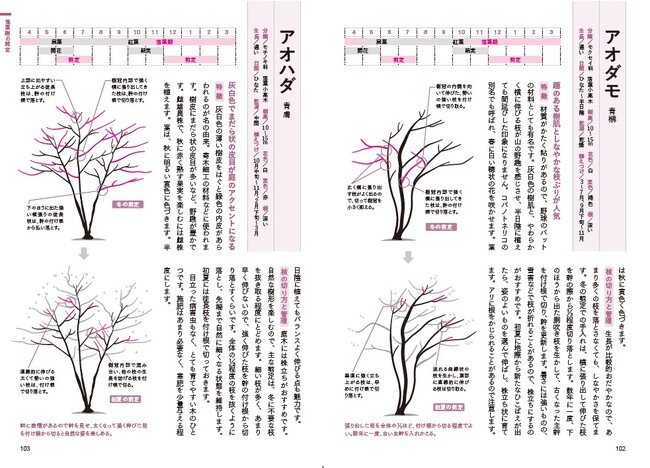 本書では、どのような枝をどの位置で切り落とすのか、イラストの中で色つき枝で表しています。また、それぞれの栽培カレンダーをつけることによって、剪定時期をはじめとした年間の管理が一目でわかるようにしています。