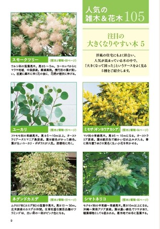 ミモザ(ギンヨウアカシア)やユーカリといったオージープランツ、アオダモ、カツラ、コナラといった定番人気の雑木、ツバキやトキワマンサクなどの日本に古くから親しまれている花木などを余すところなく収録しています。