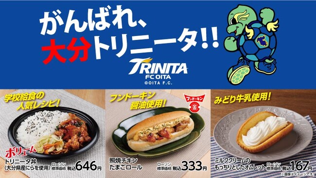 今回発売する商品は、「ボリュームトリニータ丼(大分県産にらを使用)」(税込646円)、大分県地元メーカー製造のフードキン醤油を使用した「照焼チキンたまごロール」(税込333円)、九州乳業株式会社製造の「みどり牛乳」を使用した「ミルククリームのもっちりとしたオムレット~みどり牛乳使用~」(税込167円)の3商品を発売いたします。