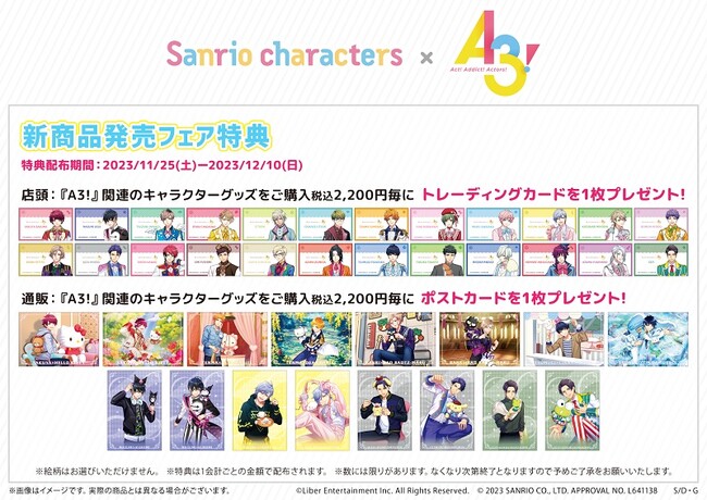 2023年11月25日(土)~12月10日(日)の間に『A3!』関連のキャラクターグッズを2,200円(税込)ご購入毎に、店頭では「トレーディングカード」を1枚ランダムでプレゼントいたします! 詳細は画像をチェックしてください。
