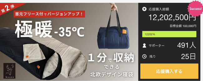 キャンプ用品メーカー株式会社ヌーカ(神奈川県藤沢市 代表取締役社長:小堺 友美)が、2023年11月22日より応援購入サービスMakuakeにて販売を開始した、極暖-35℃ 北欧デザインの寝袋「Hygge Sleep Deluxe(ヒュッゲスリープ デラックス)」は、販売開始から4日間で目標額の100倍の1,000万円(達成率10000%)を超え、1週間で1,220万円を達成いたしました。