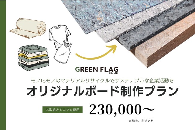 繊維のサーキュラーエコノミー事業を展開する株式会社GREEN FLAG(本社:兵庫県西宮市、代表取締役社長:安田 達生 以下GREEN FLAG)は、少量からマテリアルリサイクルを実施できる「オリジナルボード制作プラン」を開始いたしました。