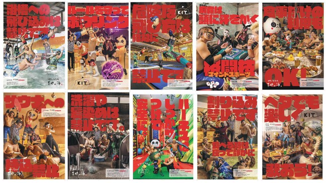 キスケ株式会社が運営する四国最大級のエンターテイメント施設「キスケBOX」内の施設 キスケKIT・キスケKIT JAO・伊予の湯治場 喜助の湯で、禁止事項をユーモラスに描いたポスターが、愛媛県最大の広告賞であるCCE AWARD 2023でポスター部門で、製作した株式会社バンブーデザインがグランプリを受賞しました。