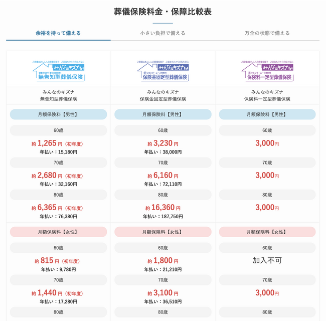 3プランの中から葬儀保険料金・保障比較できる機能をはじめ、葬儀保険以外の費用問題を解決する方法や豆知識などの情報も更新しています。見積もりから申し込みまで、インターネットで完結するため便利にご利用頂けます。