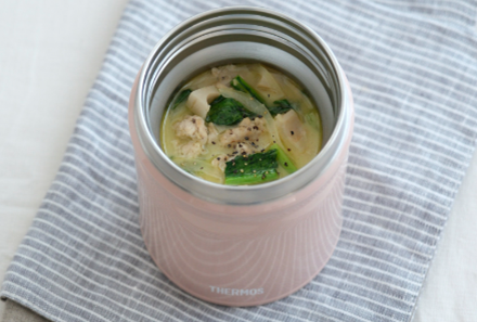 5.スープジャーの湯を捨て、4を入れる。粗びき黒こしょうをトッピングしてフタをし、30分以上保温する。
