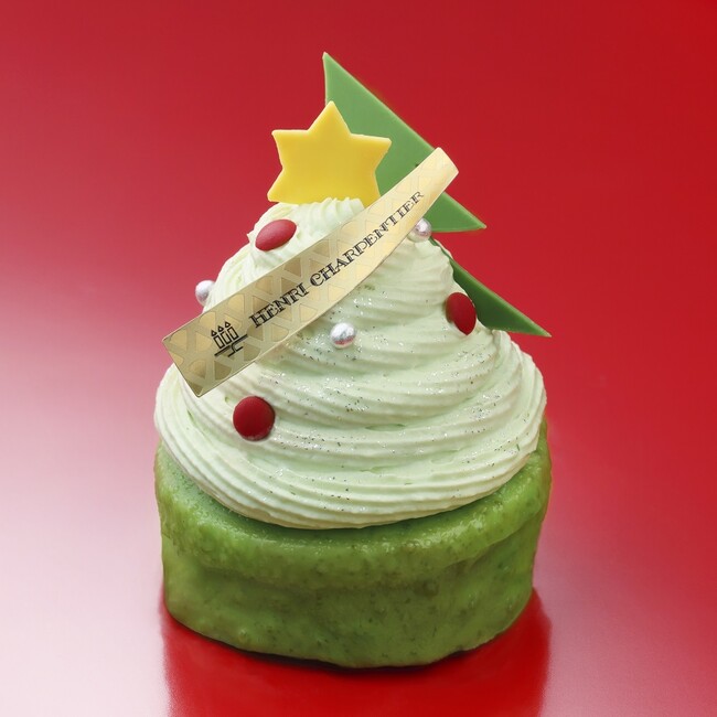 ピスタチオブラウニーの土台にピスタチオブリュレとピスタチオクリームとまさにピスタチオづくしのケーキです。中にはフランボワーズのコンフィチュールを入れ、クリスマスツリーをモチーフにしたケーキです。
