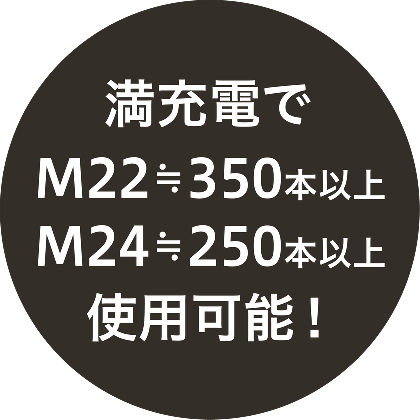 アウター・インナーソケットの交換だけで、M16~M24までのトルシアボルトの締め付けが可能で、一般的な建築物ならこれ1台で対応可能。1つの現場に複数台を現場に持ち込む手間が省けます。さらに充電式のためコードの取り回しの必要がなく、他の設備と分岐しながら使用する必要がないので最大電力で使用でき、作業効率がアップします。