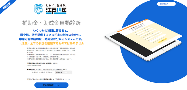 株式会社ライトアップ(本社:東京都渋谷区、代表取締役社長:白石崇、以下ライトアップ)は、東京都江戸川区へ補助金・助成金自動診断システム「Jシステム」をOEM提供し、サービスをスタートします。区内の中小企業経営者さまの補助金・助成金の活用を支援していきます。全体では24自治体目の導入となります。