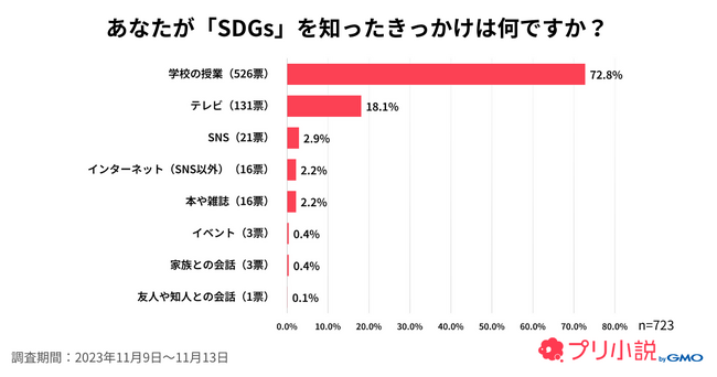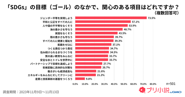 GMOインターネットグループのGMOメディア株式会社(代表取締役社長:森 輝幸 以下、GMOメディア)は、運営するチャット型小説サービス「プリ小説 byGMO」(URL:https://novel.prcm.jp/)のユーザーを対象に「SDGs」に関するアンケートを実施しました。このうち最も多い割合を占める女子中高生751名のアンケート結果をご紹介します。