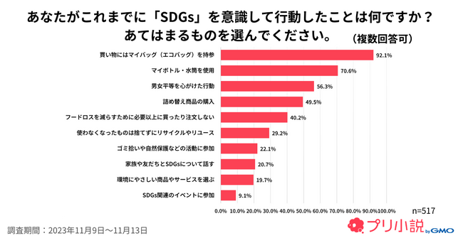 「SDGs」を意識して行動したことがあると答えた女子中高生に具体的な行動を聞いたところ、92.1%が「買い物にはマイバッグ(エコバッグ)を持参」と回答しました。「SDGs」を意識する人にとってマイバッグの持参は常識となっているようです。また、「男女平等を心がけた行動」(56.3%)が3番目に多く、関心の高い課題に対して行動できている女子中高生が多くいることが分かりました。