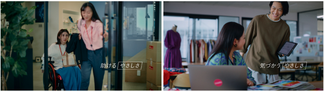 映像には、障害がある3人の職場風景を描く、2種類のCMが登場します。前半のCMでは、主人公の3人が職場で遭遇する不自由を同僚が「やさしさ」で助ける様子を、後半のCMでは「仕組み」によって不自由そのものが解消された様子を描いています。障害当事者の方々が働く中で実際に体験した出来事を元に構成した前半CMのシーンは、どれも一見ささやかな、見落とされがちで切実なエピソードです。
