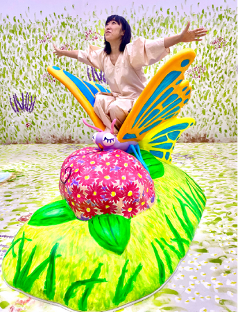自然との共生をテーマにしたお庭には、背中に乗れる巨大蝶々のオブジェが登場。乗って、写真を撮ったり、ぼんやりしてみてください。