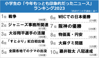 また、「野球」関連で小学生の印象に残ったニュースが多く、大谷翔平選手の活躍、阪神の優勝、WBCでの日本代表の優勝の3つがランクインしました。