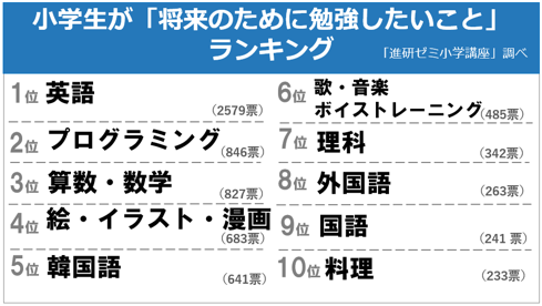 将来のために勉強したいことの1位は「英語」でした。理由は「海外で活躍したい」「外国の人と話したい」という声が多く、スポーツ選手や学者、宇宙飛行士、キャビンアテンダント、医師といった具体的な職業での使用シーンを挙げる回答も目立ちました。語学では英語に続いて「韓国語」が多く、「K-POPが好き」「アイドルになりたい」「韓国に行きたい」という想いが理由として多数挙げられていました。