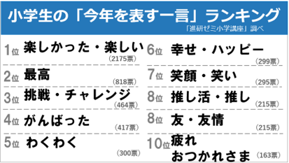 また、今年は初めてTikTok発の「なぁぜなぁぜ?」が3位にランクインしました。身近な疑問や不満を語る時に使う言葉で、小学生には「宿題があるのなぁぜなぁぜ?」「どんだけ部屋を片付けてもすぐ散らかっちゃうのなぁぜなぁぜ?」といった形で使われています。