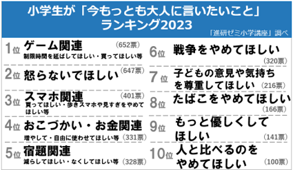 小学生にとって、もっとも印象的だったのは「戦争」で、ロシアとウクライナ、イスラエルとハマスの衝突に関するニュースでした。戦争に関する子どもたちの課題意識は強く、「今、大人に一番言いたいこと」を聞いた質問では、「戦争をやめてほしい」という声が多く寄せられており、ゲームやスマホ、おこづかいなどに関する自身の希望に続いて、上位に入りました。