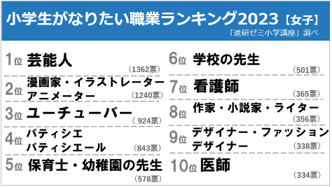 調査を開始した2020年から4年連続で「YouTuber」が1位となりました。また、上位には芸能、漫画やアニメなどのエンタメ関連の仕事が入っています。エンタメは子どもにとって身近で、将来挑戦してみたい仕事として意識されていると考えられます。将来に向けて勉強したいことに関する質問項目でも、「絵・イラスト・漫画」「歌・音楽・ボイストレーニング」が上位に入っており、子どもたちが「なりたい職業」に関連した勉強をがんばりたいと思っていることがわかります。