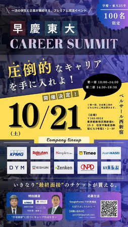 ハイレベル新卒採用イベントを各地で展開する株式会社最強(東京都港区西新橋2-8-18共立ビル2階、代表取締役:穴田大空)は、Percify株式会社、株式会社ライトローズと共同で2023年10月21日(土)にキャリアイベント「早慶東大CAREER SUMMIT 2023」を開催いたしました。