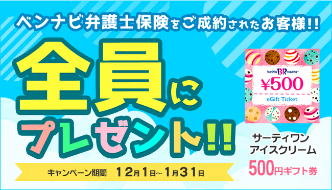 「ベンナビ弁護士保険」ご成約で「サーティワン アイスクリーム 500円ギフト券」もれなくプレゼント【弁護士保険STATION】