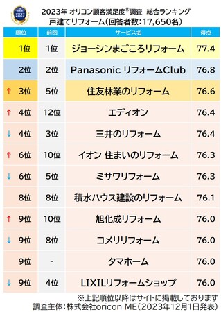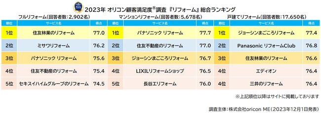 2023年 満足度の高い『リフォーム』ランキング |『フルリフォーム』は【住友林業のリフォーム】が初の総合1位 費用別「500~700万円未満」「1000万円以上」でも1位に(オリコン顧客満足度)