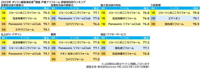 全7つの評価項目別ランキングでは、「営業担当者の接客力」「営業担当者の提案力」「施工担当者の対応」「工程管理」「費用」「保証・アフターサービス」の6項目で1位に。
