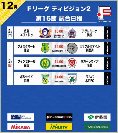 12月2日(土)、3日(日)にFリーグ2023-2024 ディビジョン2 第16節の4試合を開催いたします。