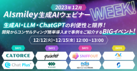 【2023年12月AIsmiley生成ウェビナーWeeK!】 生成AI・LLM・ChatGPTの利便性と限界!開発からコンサルティング簡単導入まで事例をご紹介するBIGイベント!