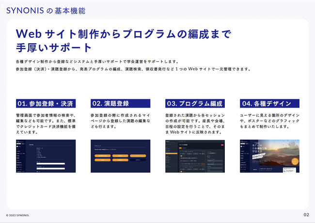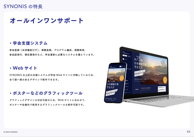 ・Webサイトの制作からまとめてお任せください。SYNONISは参加登録フォームや演題検索などの機能が全てWebサイトの内部に実装されるので、統一されたデザインを提供することができます。