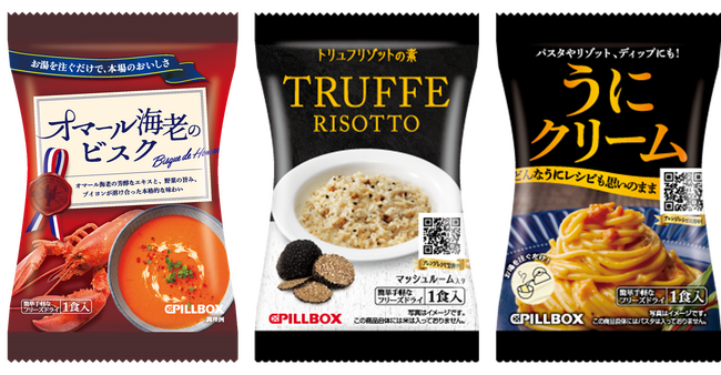 この度、ピルボックスジャパン株式会社(本社:東京都港区北青山、代表取締役:栖原 徹)は、 これまで自社インターネット通販でのお取り扱いのみだったフリーズドライシリーズ「オマール海老のビスク」「トリュフリゾットの素」「うにクリーム」の3品を、2023年12月1日(金)より全国のスーパーマーケットでの販売を順次開始いたしました。