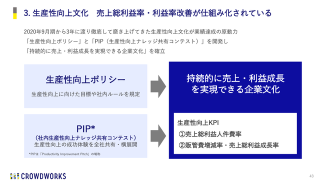 当社グループは2020年9月期から自らの事業の力で持続可能な経営を行える状態を目指し、販促費を適切に管理しながら売上成長と利益最大化を目指す「生産性向上」に取り組んでまいりました。この生産性向上の取り組みにより、3年連続の売上総利益+20%以上成長および2023年9月期の過去最高売上・売上総利益を達成しており、安定的な成長基盤が構築されています。