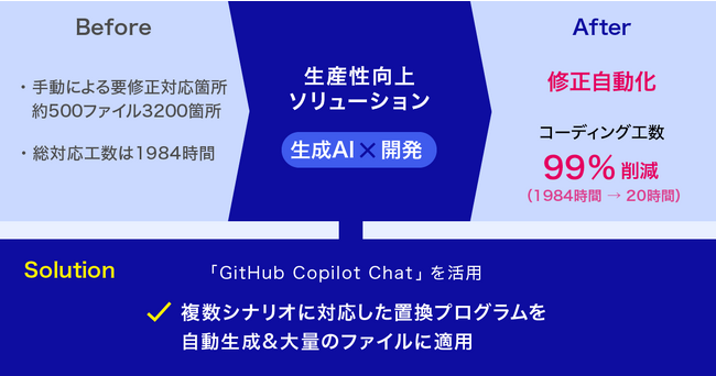1.生成AI×ソフトウェア開発!「GitHub Copilot Chatを活用し、コード修正の対応工数を99%(1984時間→20時間)に削減」
