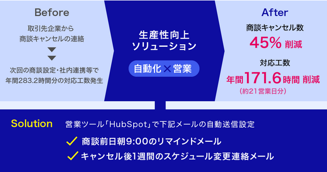 3.自動化×営業!「商談スケジュール調整対応の自動化で、商談キャンセル数 45%削減、対応工数 年間約21営業日分削減」