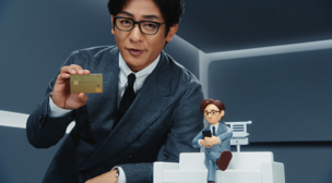 光のラインが走る抽象空間に佇む片岡愛之助さん。愛之助さんそっくりのミニチュアがソファーに座っている中央のスチール台に歩み寄りながら、「今日のテーマはワンタイムパスワード」と呼びかけて、スマホとJCBカードを掲げます。ネットショッピングの商品が表示されているスマホを、ソファーの後ろのスタンドにセットすると、人形の腕が上下に動いて自らのスマホをスワイプ。すると、そのアクションと連動して背後のスマホ内の購入ボタンが反応し、カード画面から、一回限り有効なワンタイムパスワードの発行画面に切り替わります。