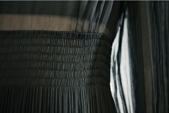 アリシア・ヴィキャンデルが着用したドレスは、ウエスト周りとバックトレーンにスモックのディテールが施され、スカートにあしらわれたフリルはすべてマイクロ・フリルのように重ね合わされたデザインになっています。