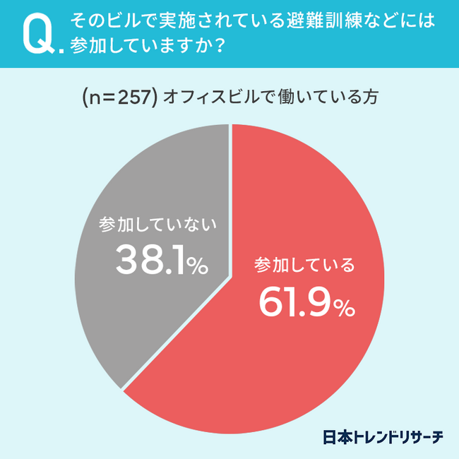 61.9%と、こちらも半数以上の方が、オフィスビルで実施されている避難訓練などに「参加している」と回答しています。