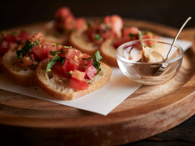 あぶり海苔巻き、チーズ焼きせんべい、カッテージチーズ白和え、洋風漬け冷やっことモッツァレラチーズのしょうゆ漬け、ちくわ天3種/カマカバ、はんぺんゾーラドルチェ/ミックスナッツ柚子こしょうあえ、そばの実揚げ/北京ダックもどき、きゅうりのオープンサンド、ごまみそスプレッド、エビパン、ツナ缶おこげ・パセリソース