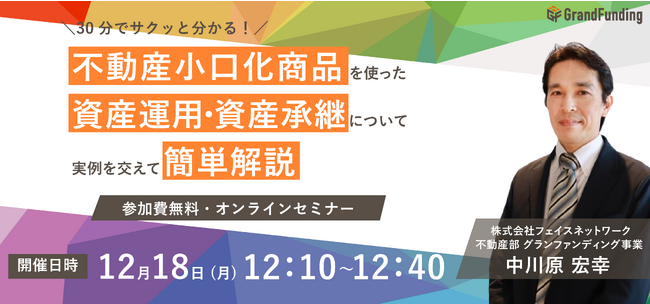 東京の城南3区エリア(世田谷区・目黒区・渋谷区)を中心に、主に新築一棟RCマンションによる不動産投資支援事業を展開する株式会社フェイスネットワーク(本社:東京都渋谷区、代表取締役社長:蜂谷 二郎、以下 「当社」という。)は、資産承継に有効な商品として注目を集める不動産小口化商品に関するオンラインセミナーを12月18日(月)に開催することをお知らせいたします。