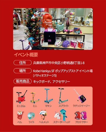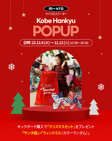 マイクロスクーターはキックボードの専門ブランドとして、成長段階・年齢・目的に応じてさまざまなキックボード製品を販売しています。 この度、神戸阪急本館5階にてマイクロスクーターの商品を購入できるポップアップストアを営業します。また、対象のキックボード購入でサンタ袋をプレゼントするキャンペーンも実施します。