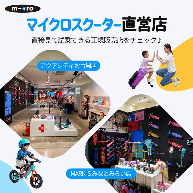 マイクロスクーターの直営店であるアクアシティお台場店とMARK IS みなとみらい店はキックボード、ヘルメットやプロテクター、アクセサリー、インラインスケートまで各種製品を揃え、子どもから大人まで家族一緒に楽しめる売り場です。