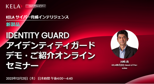 サイバー脅威インテリジェンスを提供するKELA Research and Strategy, Ltd.(ケラ、本社:イスラエル)社の日本法人であるKELA株式会社 (東京都千代田区、代表取締役: ドロン・レヴィット)は、来る12月21日(木)、KELA サイバー脅威インテリジェンス オンラインセミナーを開催します。今回は、KELAが提供するサイバー脅威インテリジェンスの最新製品「IDENTITY GUARD(アイデンティティガード)」について、ソリューションの概要と事例をご紹介し、デモンストレーションも行います。
