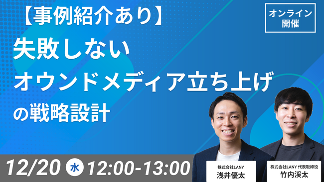 SEOコンサルティングサービスを提供する株式会社LANY(東京都渋谷区、代表取締役社長:竹内渓太)は、【事例紹介あり】失敗しないオウンドメディア立ち上げの戦略設計を解説するウェビナーを12/20(水)に開催いたします。