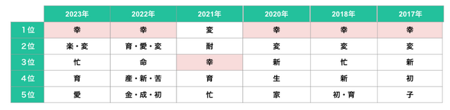 妊娠・出産というライフイベントにより幸せを実感する方が多いことから、過去6回実施したうち5回は「幸」が1位を獲得しています。2021年は新型コロナウイルス予防のためステイホームの意識が高まったことから「耐」が初のランクインとなりました。