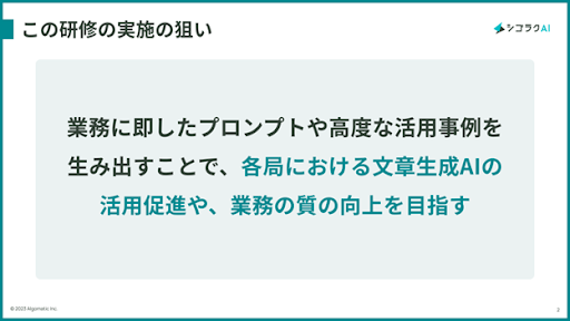 今回、Algomaticでは、文章生成AIのさらなる活用促進や業務の質の向上を目指し、東京都職員向けにアイデアソンを提供し、効果的なAIの活用方法を学んでもらうとともに、庁内の業務に即したプロンプト(AIへの指示文)の作成支援を行いました。