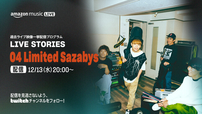 Amazon Musicは、12月12日(火)より、04 Limited Sazabysのライブ収録映像を3夜連続でTwitchのAmazon Music Japan チャンネルにて配信します。メインとなるのは12月14日(木)20時から配信する、2万人を熱狂させた7年ぶり2度目の日本武道館ワンマン公演「15th Anniversary 『THE BAND OF LIFE』」(11月11日、12日開催)のライブ収録映像を特別に編集し、メンバーの生トークとともにお楽しみいただける番組です。その番組の配信に向けて、12月12日(火)20時から、過去のライブ映像を一挙2時間にわたり紹介する『04 Limited Sazabysライブストーリーズ 2014-2023』を、また12月13日(水)20時から、武道館ライブ会場で2024年の開催日程が発表されたバンド主催フェス「YON FES」の2023年のライブ映像をメンバーの解説付きで楽しむスペシャル番組を配信し、メインとなるAmazon Music Live:「04 Limited Sazabys 15th Anniversary 『THE BAND OF LIFE』」までの夜を盛り上げます。