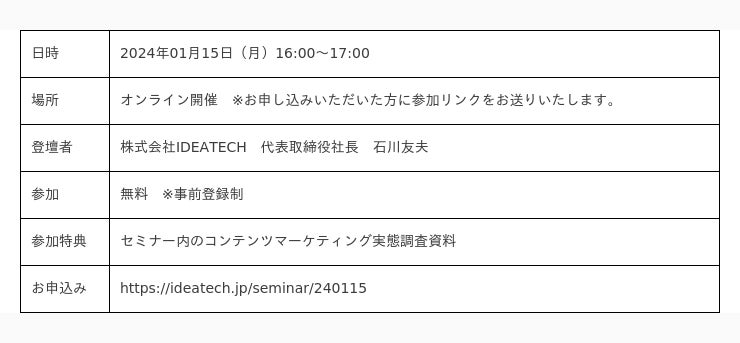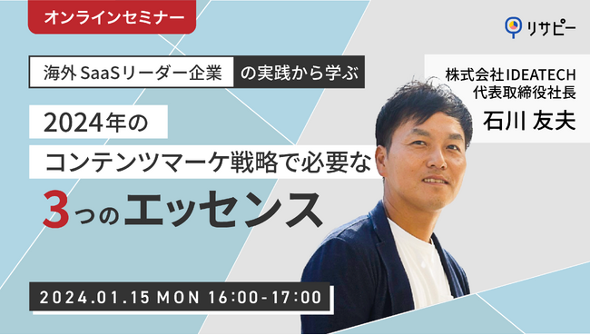 海外SaaSリーダー企業の実践から学ぶ:2024年のコンテンツマーケ戦略で必要な3つのエッセンスセミナー開催:https://ideatech.jp/seminar/240115