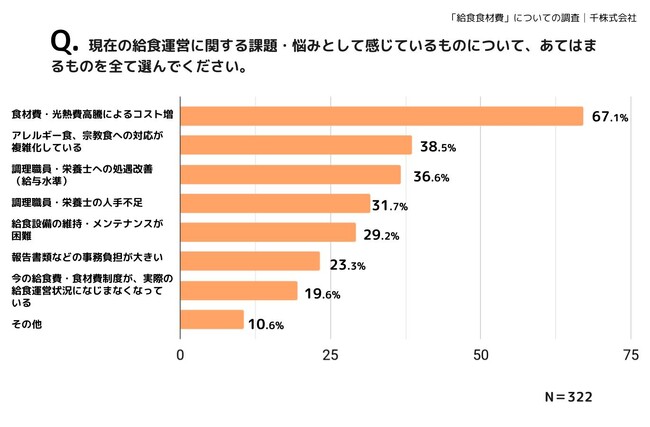 また、「調理職員・栄養士への処遇改善(給与水準)」(36.6%)も悩みとして多く挙げられ金銭面で特に課題を感じている中、「保護者からの徴収額を上げることは困難」「補助金も限られている」というコメントも目立ち、給食にかかるコストと予算の乖離が大きくなっていることが今回の調査から読み取れます。