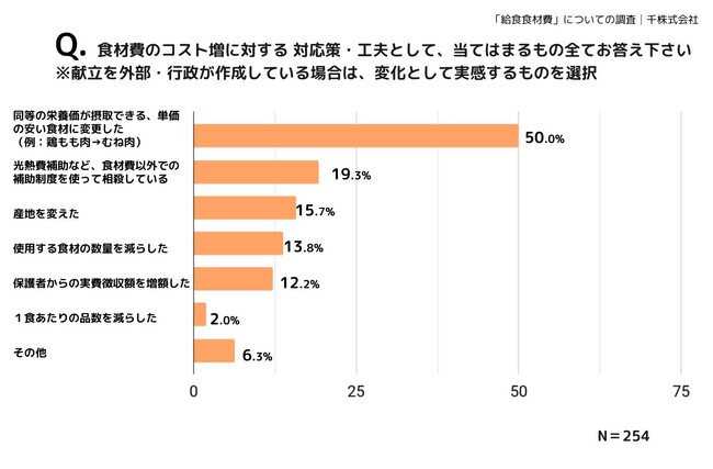 コスト増を補うための対応策・工夫として各施設「単価の安い食材に変更」(50.0%)、光熱費補助など、食材費以外での補助制度を使って相殺している(19.3%)、産地を変えた(15.7%)、使用する食材の数量を減らした(13.8%)、保護者からの実費徴収額を増額した(12.2%)、1食あたりの品数を減らした(2.0%)など、各施設で品数や使用食材を減らさないよう様々な努力は行っているものの、その一方で食材を減らしたり品数を減らしたりする幼保施設もありました。施設によっては、「(不足分は)施設が負担している」との回答もあり、光熱費補助などを使って相殺していることからもわかるように、幼保施設にとって財政的な負担となっていると言えそうです。